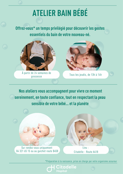 Nous vous proposons un atelier bain bébé pour vous accompagner dans les premiers gestes essentiels du bain de votre enfant. Ce temps privilégié vous permet d’acquérir les bons repères, en toute sérénité, dès la grossesse.