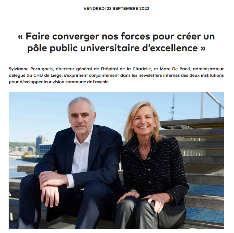 Partager FacebookTwitterLinkedInE-mail Accueil Actualités Sylvianne Portugaels (Citadelle) et Marc D... Actualité Interview Sylvianne Portugaels (Citadelle) et Marc De Paoli (CHU de Liège) : « Nous devons faire converger nos forces ! » 23/09/2022 Lire le document "Faire converger nos forces pour créer un pôle public universitaire d’excellence" Retour vers toutes nos actualités