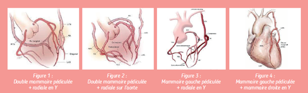 Le montage du pontage tout artériel peut être fait en utilisant les deux artères mammaires et/ou l’artère radiale, selon différents montages illustrés dans les figures 1 à 4.