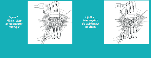 La cavité pleurale est ouverte et le poumon gauche est exsufflé de façon à prélever l’artère mammaire jusqu’à la veine sous-clavière gauche. Le stabilisateur cardiaque est mis en place et l’anastomose coronaire est réalisée coeur battant et sans circulation extra-corporelle.