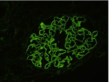 Figure 1 : Examen par immunofluorescence d’un glomérule. Dépôts mésangiaux d’IgA. Maladie de Berger.