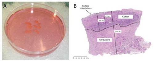 Figure 4 : Cryopréservation de tissu ovarien. A Préparation de la biopsie ovarienne afin de ne garder que le cortex que l’on coupe en fragments de +/- 5mm2. B Histologie du tissu ovarien où l’on peut voir que la réserve ovarienne en follicules primordiaux est située dans le cortex ovarien.