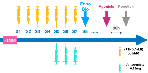 Figure 2 : Schéma de stimulation hormonale, de type antagoniste, requis pour une cryopréservation ovocytaire.