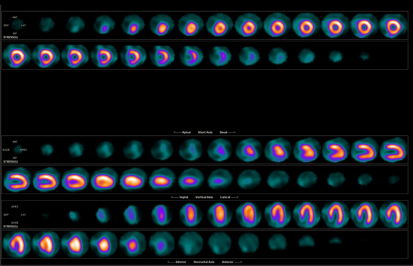 En outre, la tomoscintigraphie myocardique synchronisée à l’ECG (ou Gated SPECT) pratiquée en routine depuis de nombreuses années permet l’évaluation de la cinétique pariétale du VG et la détermination de la fraction d’éjection ventriculaire gauche, qui constitue également un paramètre important à l’élaboration de la stratégie thérapeutique.